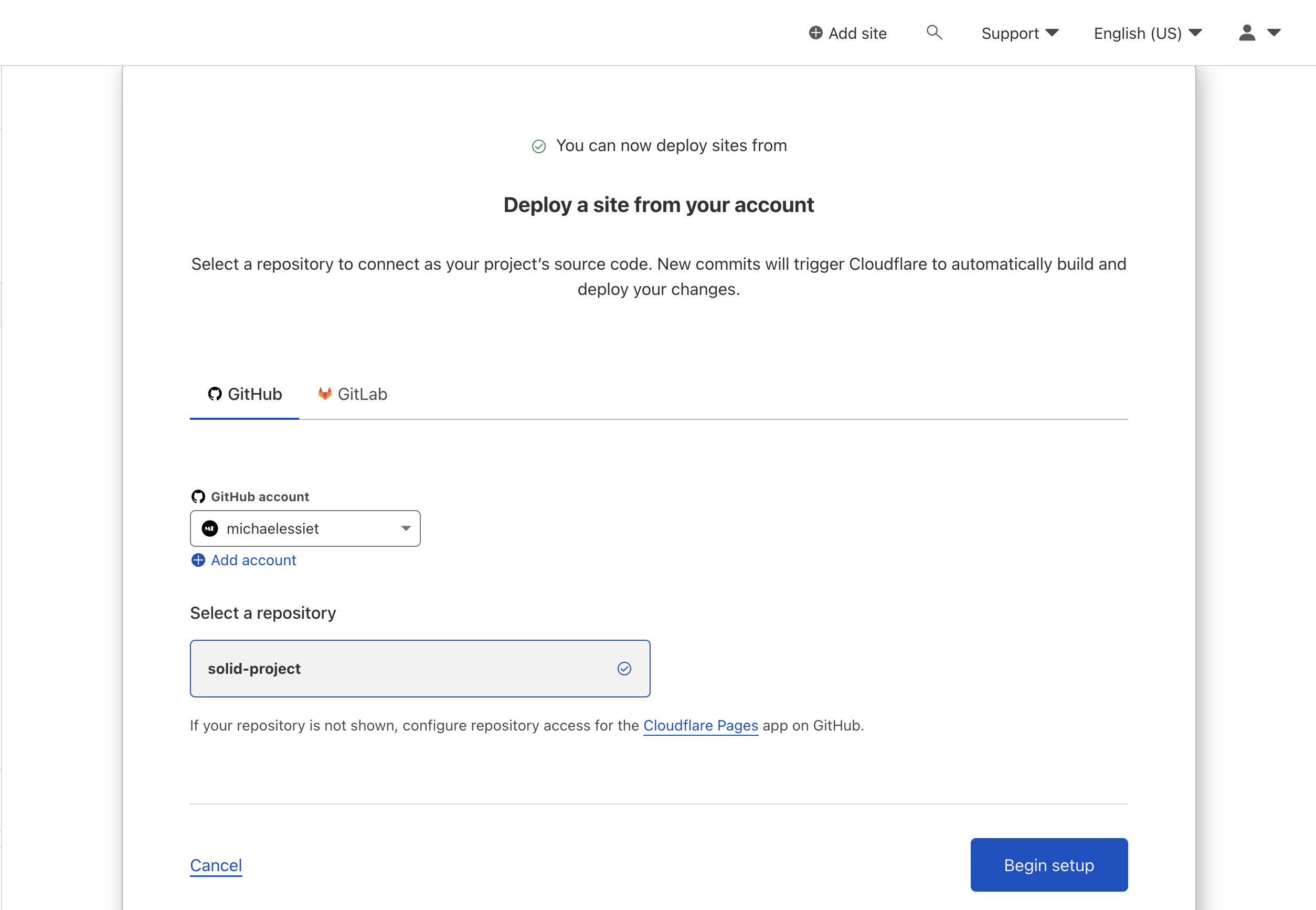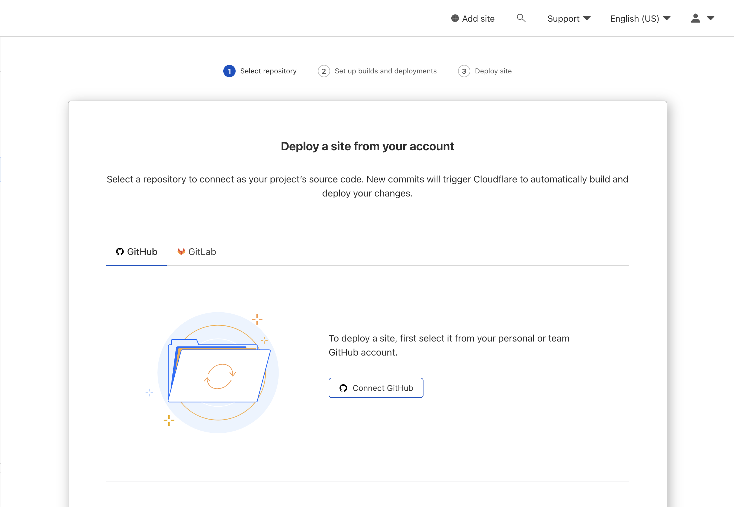 Примечание: В качестве примера мы будем использовать GitHub. Однако Cloudflare позволяет подключать и репозитории GitLab.