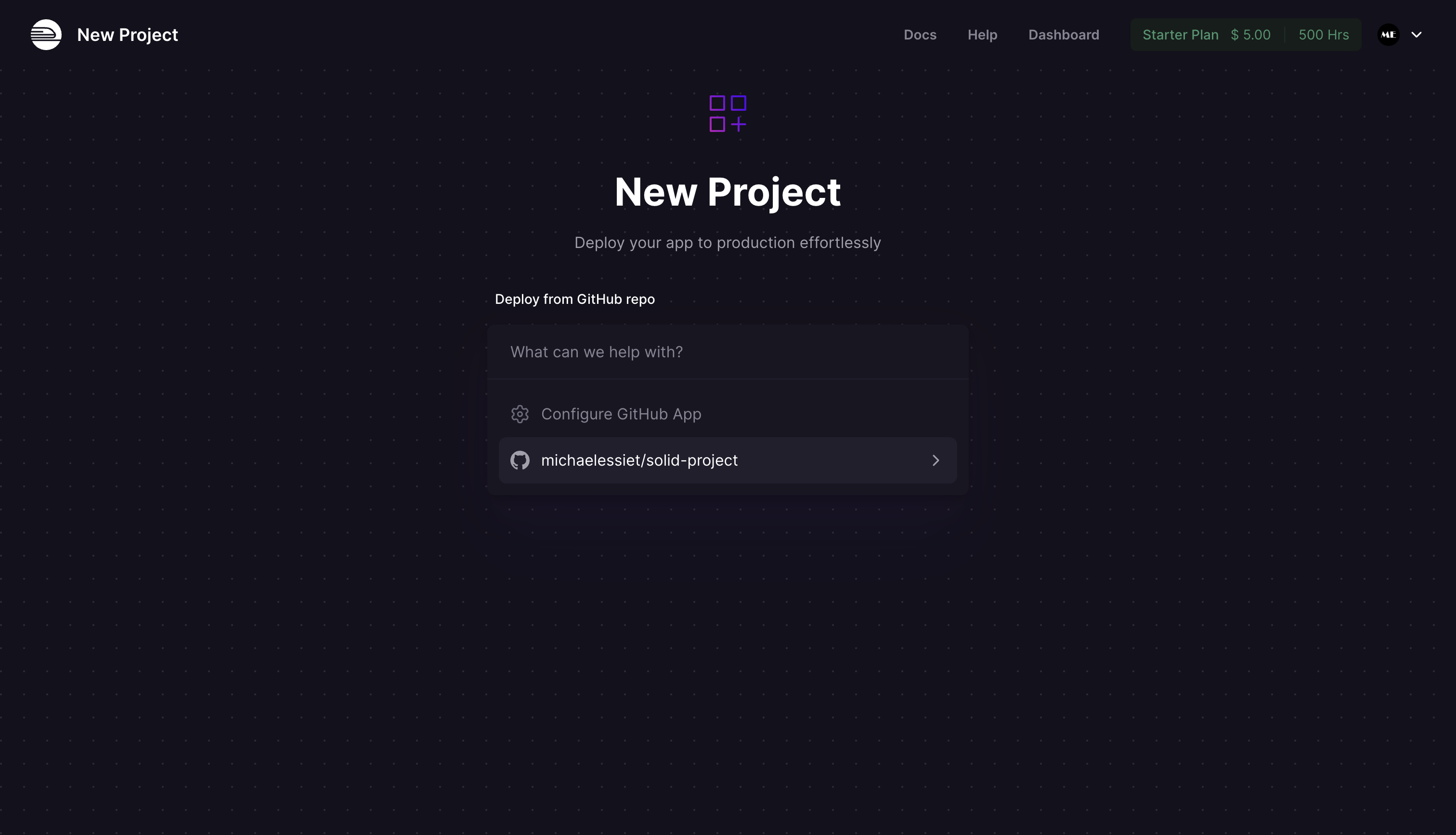 Шаг 2: После авторизации Railway для установки в ваши репозитории вы будете перенаправлены обратно на сайт Railway, где сможете выбрать репозиторий, содержащий ваш проект Solid. Экран должен выглядеть примерно так
