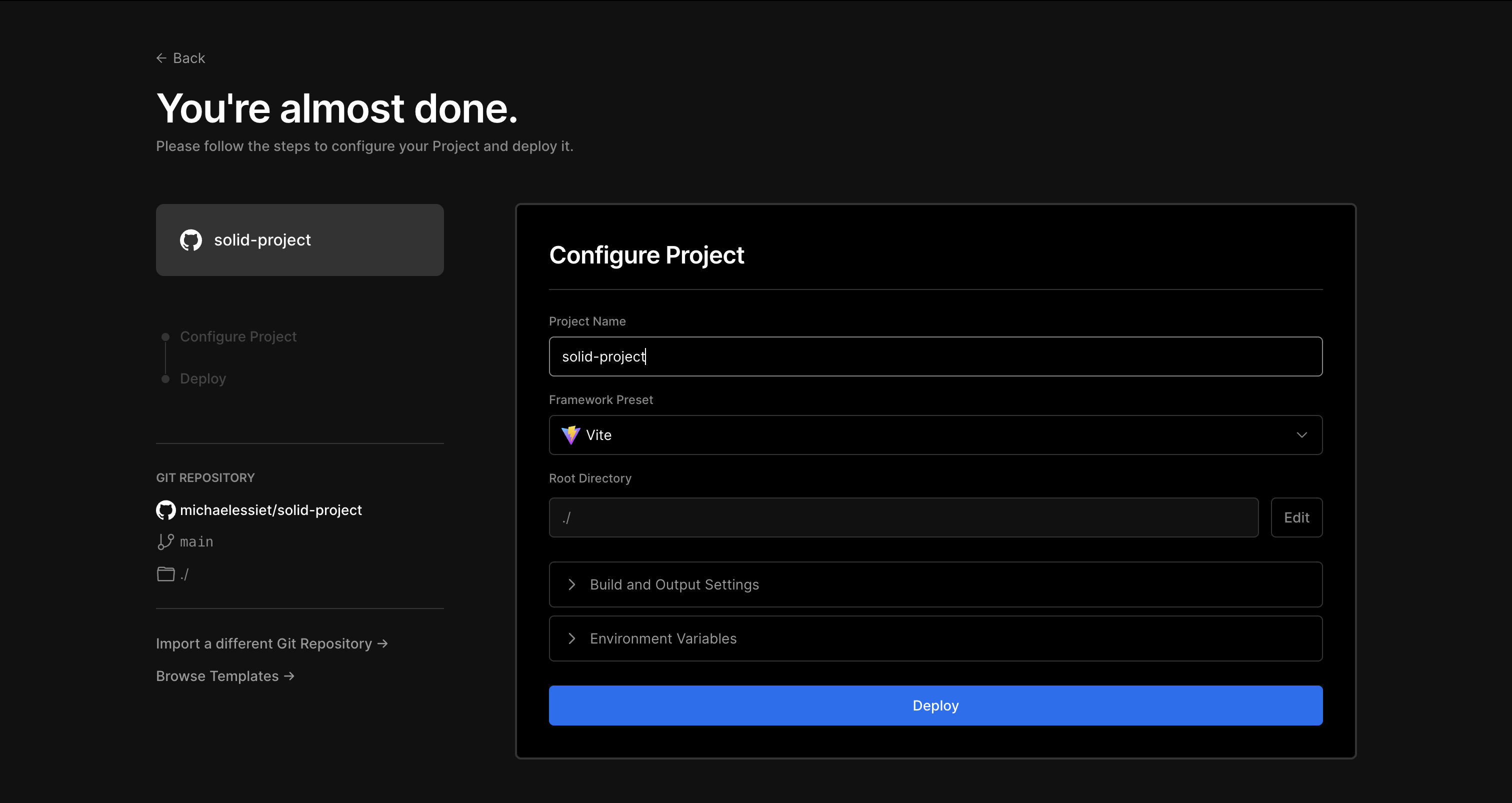 Следуйте инструкциям, предлагаемым инструментом командной строки. После этого ваш проект должен быть развернут в Vercel. (например, solid.vercel.app)